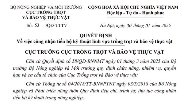 Ngày 30 tháng 01 năm 2026, Cục Trồng trọt và Bảo vệ thực - Bộ NN&MT, Quyết định số: 53/QĐ-TTTV, Về việc công nhận tiến bộ kỹ thuật lĩnh vực trồng trọt và bảo vệ thực vật