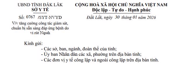 Ngày 30 tháng 01 năm 2026, Sở Y tế tỉnh Đắk Lắk, công văn số: 0767/SYT-NVYD, Về việc tăng cường công tác giám sát, chuẩn bị sẵn sàng đáp ứng bệnh do vi rút Nipah