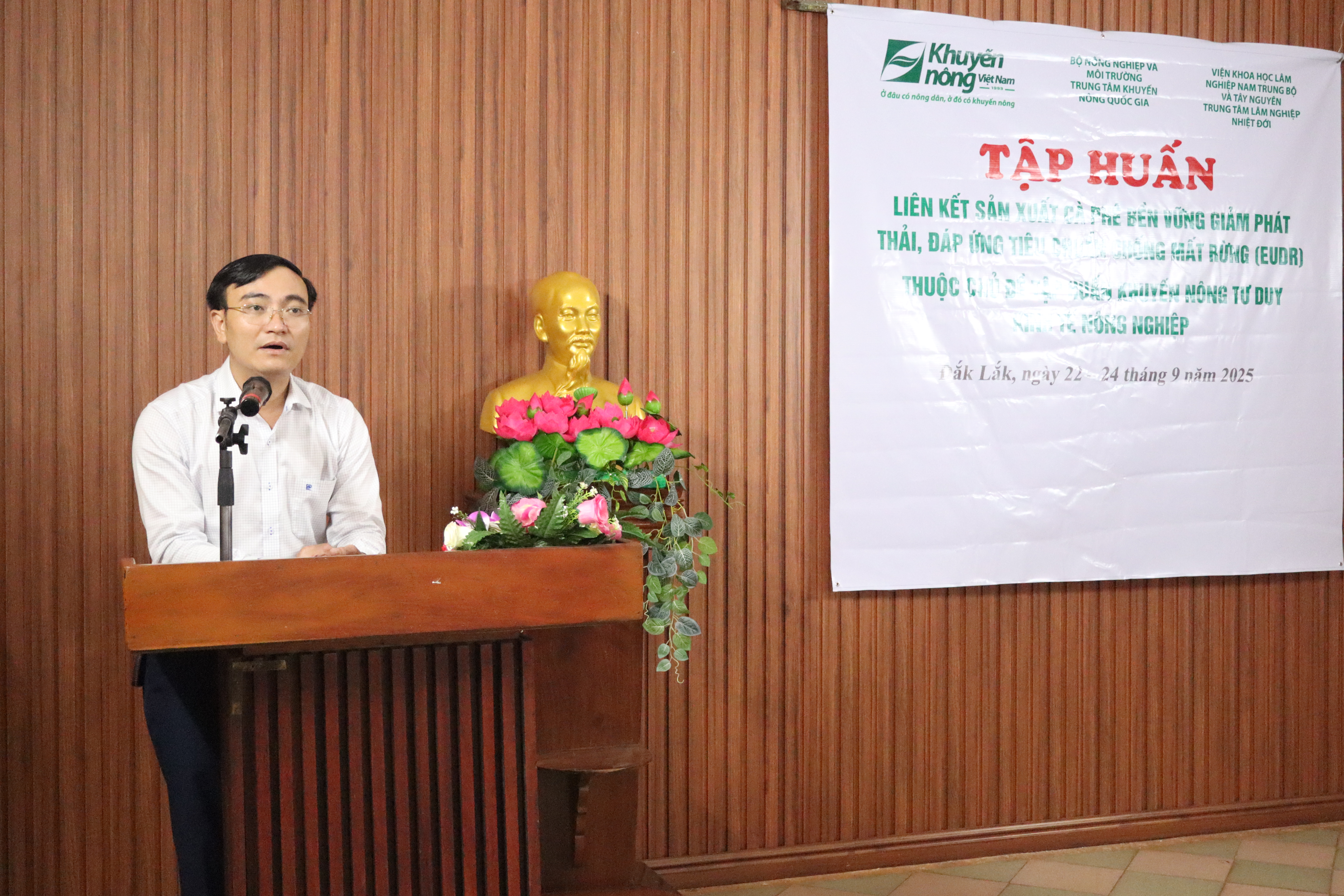 Phát biểu chỉ đạo tại buổi khai mạc, đồng chí Đinh Văn Đang – Giám đốc Trung tâm Khuyến nông Đắk Lắk nhấn mạnh việc nắm bắt và triển khai các yêu cầu mới từ thị trường quốc tế, nhất là quy định EUDR, giữ vai trò then chốt đối với sự phát triển của ngành hàng cà phê. Trung tâm Khuyến nông tỉnh xác định đội ngũ cán bộ khuyến nông phải là lực lượng tiên phong, vừa tiếp thu tri thức mới, vừa đồng hành, hướng dẫn bà con nông dân, hợp tác xã và doanh nghiệp địa phương xây dựng mô hình sản xuất cà phê xanh – sạch – bền vững. Đây cũng là nhiệm vụ quan trọng để cà phê Đắk Lắk khẳng định thương hiệu, mở rộng thị trường xuất khẩu và phát triển lâu dài.