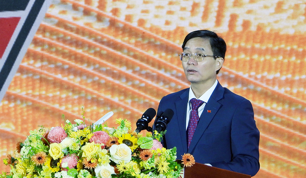 Đồng chí Nguyễn Đình Trung - Ủy viên Trung ương Đảng, Bí thư Tỉnh ủy phát biểu tại buổi lễ.