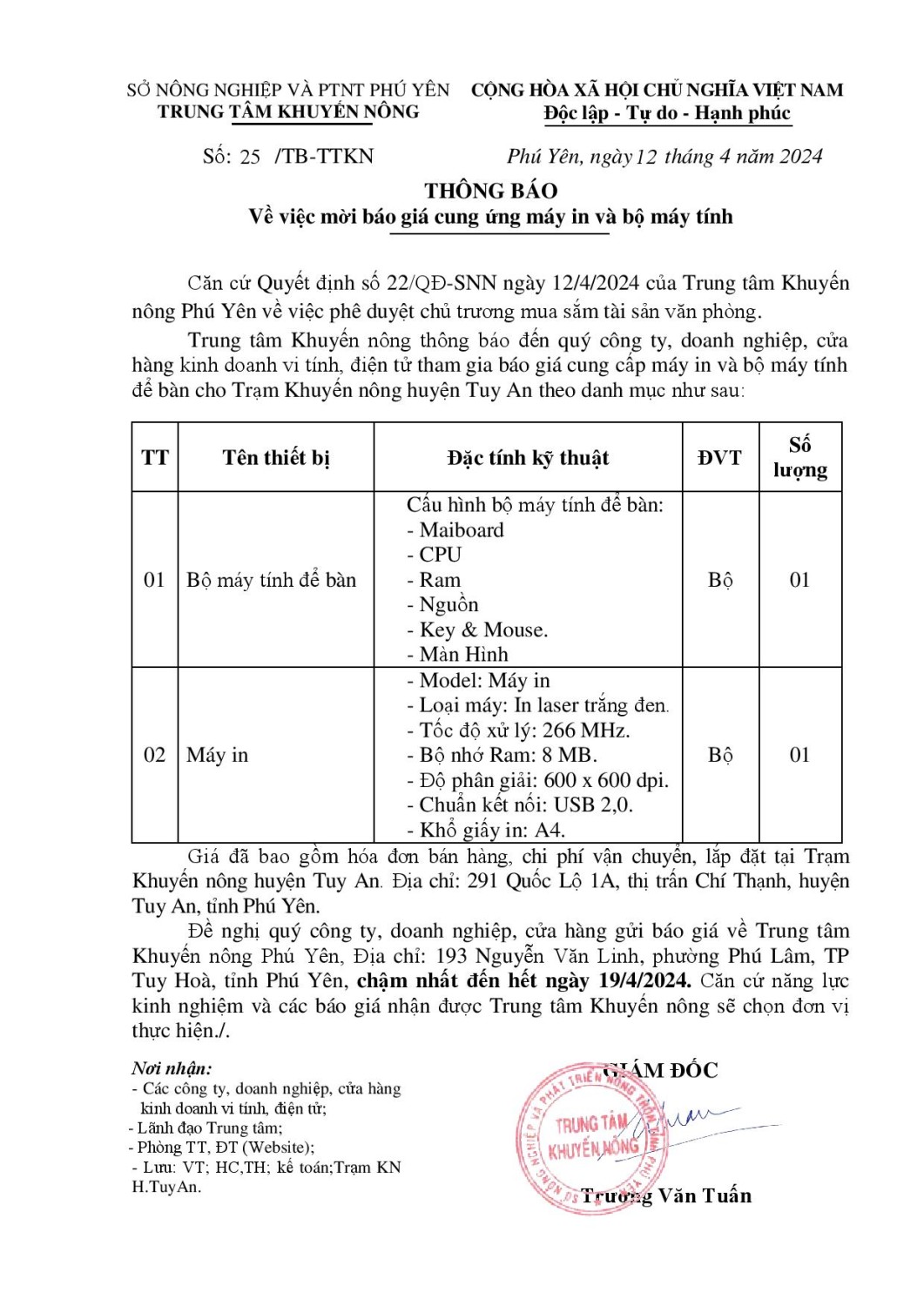 Thông báo số 25/TB-TTKN ngày 12/4/2024 của Trung tâm Khuyến nông về việc mời báo giá cung ứng máy in và bộ máy tính