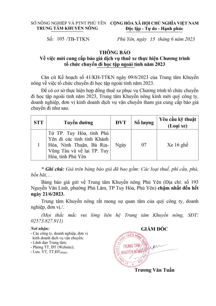 Thông báo 105/TB-TTKN ngày 15/6/2023 của Trung tâm Khuyến nông về việc mời cung cấp báo giá dịch vụ thuê xe thực hiện Chương trình tổ chức chuyến đi học tập ngoài tỉnh năm 2023