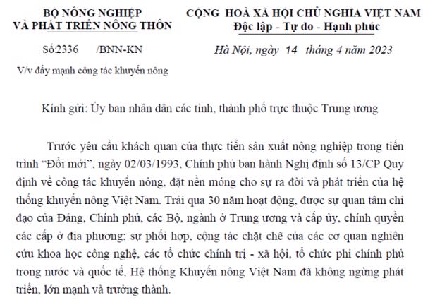 Ngày 25 tháng 9 năm 2023, Công văn số: 947/KN-TCHC, Hệ thống Khuyến nông Việt Nam được thành lập từ năm 1993 theo Nghị định số 13/CP ngày 02/03/1993 của Chính phủ về Khuyến nông.