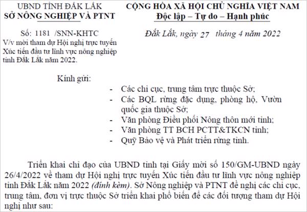 ngày 12 tháng 12 năm 2022, Sở Nông nghiệp và phát triển nông thôn, ban hành công văn số: 4111/KH-SNN Tìm kiếm giải pháp, sáng kiến trong việc thực hiện cơ cấu lại ngành nông nghiệp tỉnh Đắk Lắk giai...