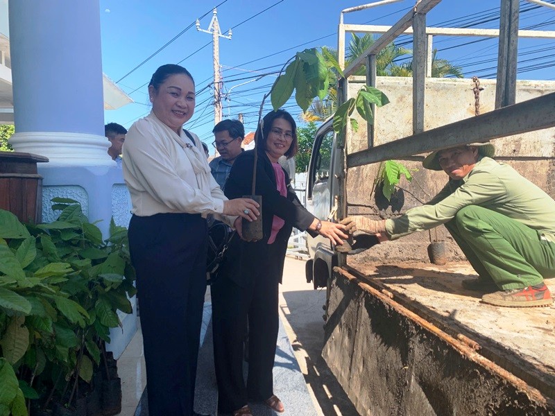 Bà Đoàn Thị Kim Xuyến, Giám đốc Công ty TNHH Cacao Land, nhà tài trợ giống ca cao và bà Huỳnh Thị Kim Nga, Phó Giám đốc Trung tâm Khuyến nông Đắk Lắk, tham gia bàn giao cây giống cho nông dân tại các xã khu vực phía Đông tỉnh Đắk Lắk.
