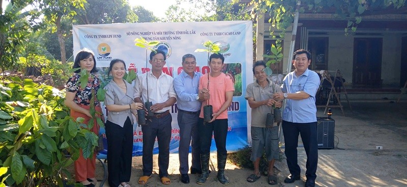 Lễ bàn giao cây giống ca cao cho nông dân các xã khu vực phía Đông tỉnh Đắk Lắk với sự tham dự của đại diện chính quyền địa phương, Công ty TNHH Cacao Land và Trung tâm Khuyến nông Đắk Lắk.