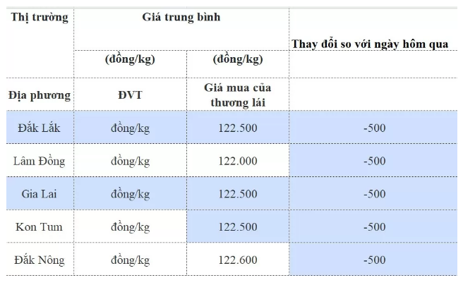 Cụ thể, giá cà phê thu mua tại tỉnh Gia Lai (Chư Prông) là 122.500 đồng, ở Pleiku và La Grai cùng giá 122.400 đồng/kg; tại tỉnh Kon Tum cà phê được thu mua ở mức giá 122.500 đồng/kg; tại tỉnh Đắk Nông cà phê được thu mua với giá cao nhất 122.600 đồng/kg.
