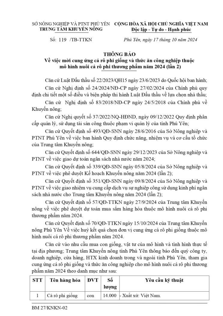Thông báo số 119/TB-TTKN ngày 17/10/2024 của Trung tâm Khuyến nông về việc mời cung ứng cá rô phi giống và thức ăn công nghiệp thuộc mô hình nuôi cá rô phi thương phẩm năm 2024 (lần 2)