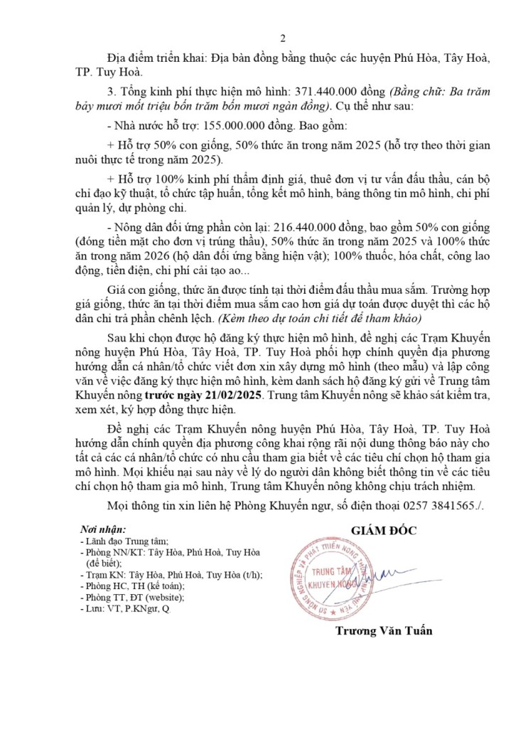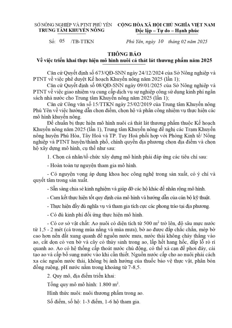 Thông báo số 05/TB-TTKN ngày 10/02/2025 của Trung tâm Khuyến nông về việc triển khai thực hiện mô hình nuôi cá thát lát thương phẩm năm 2025