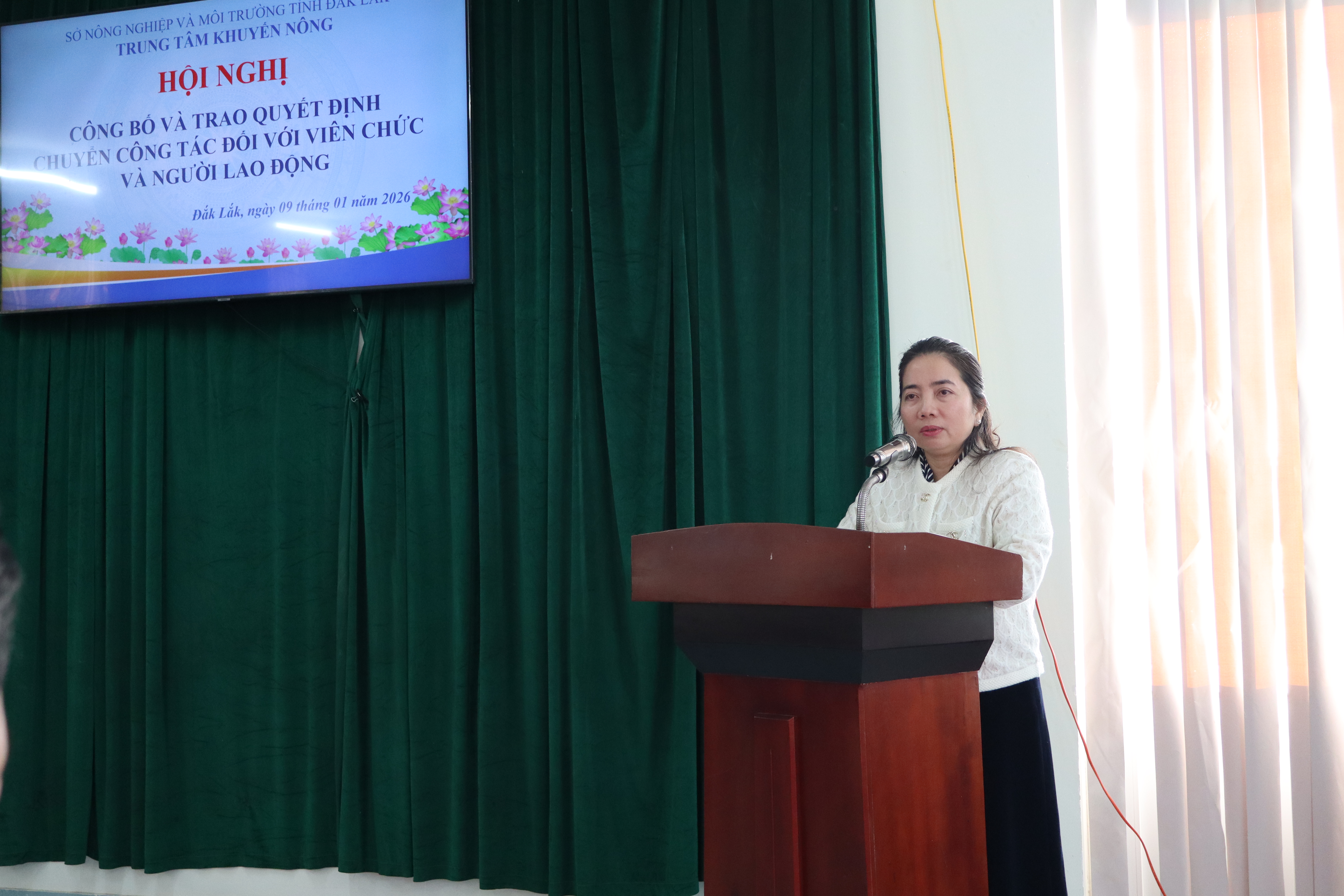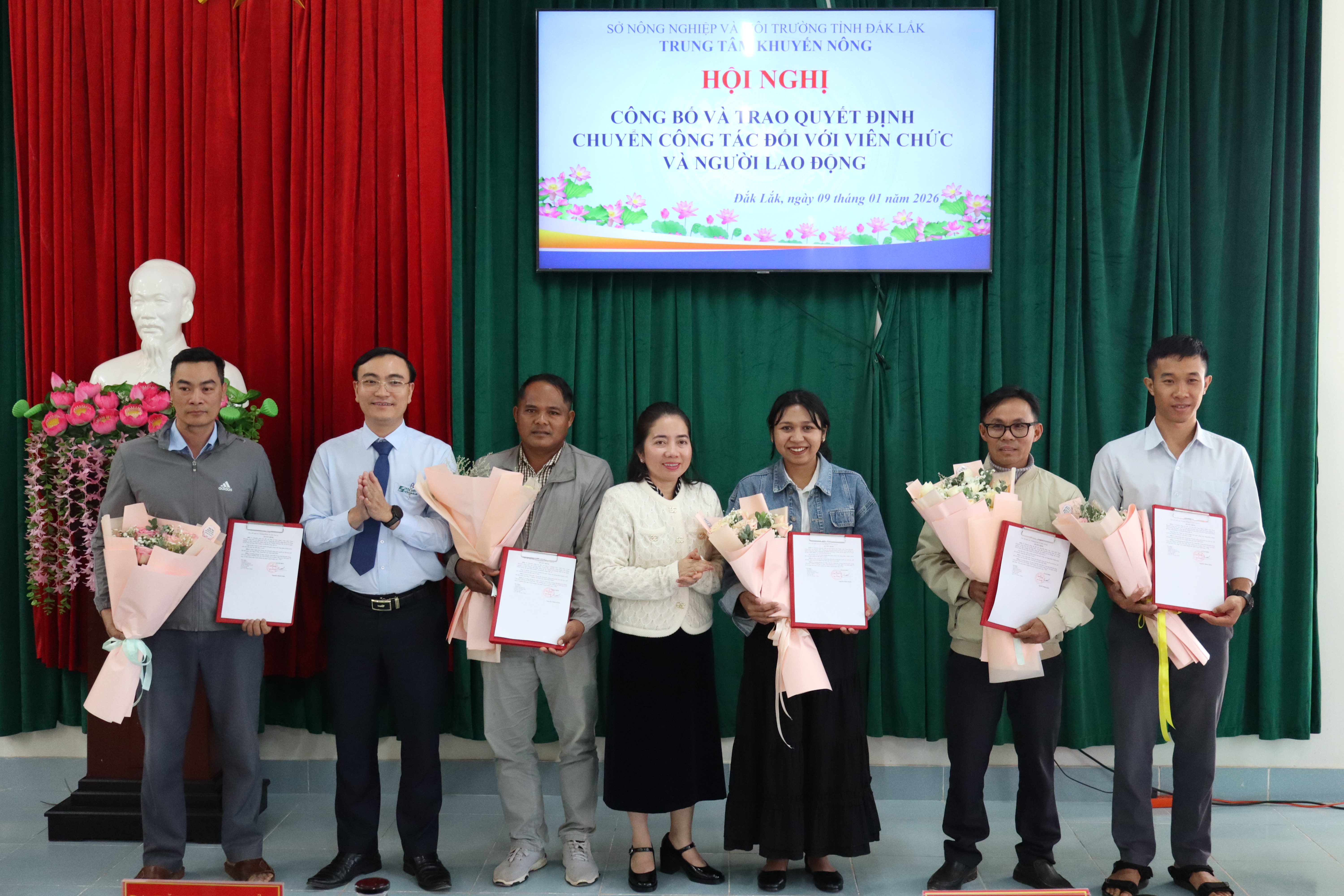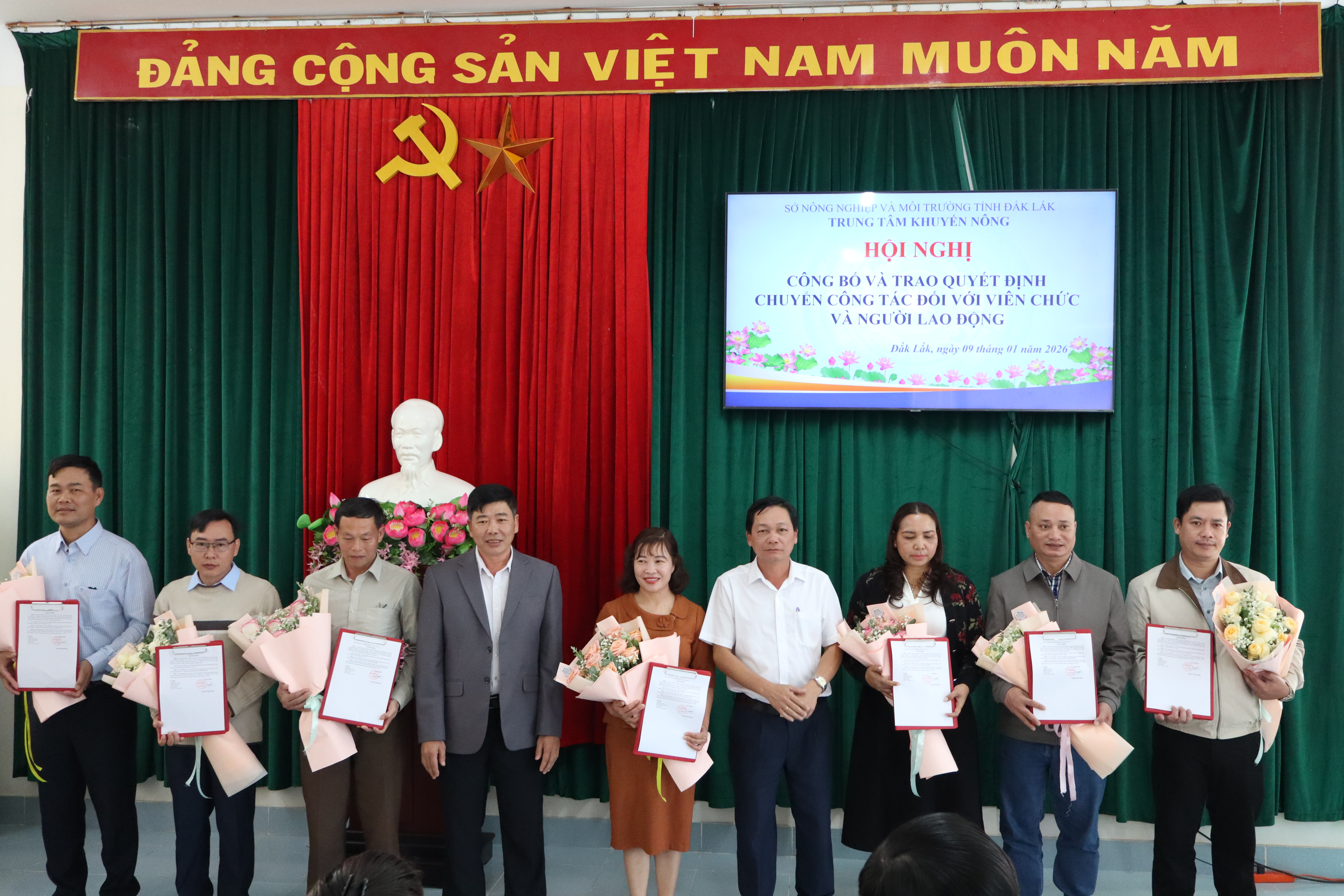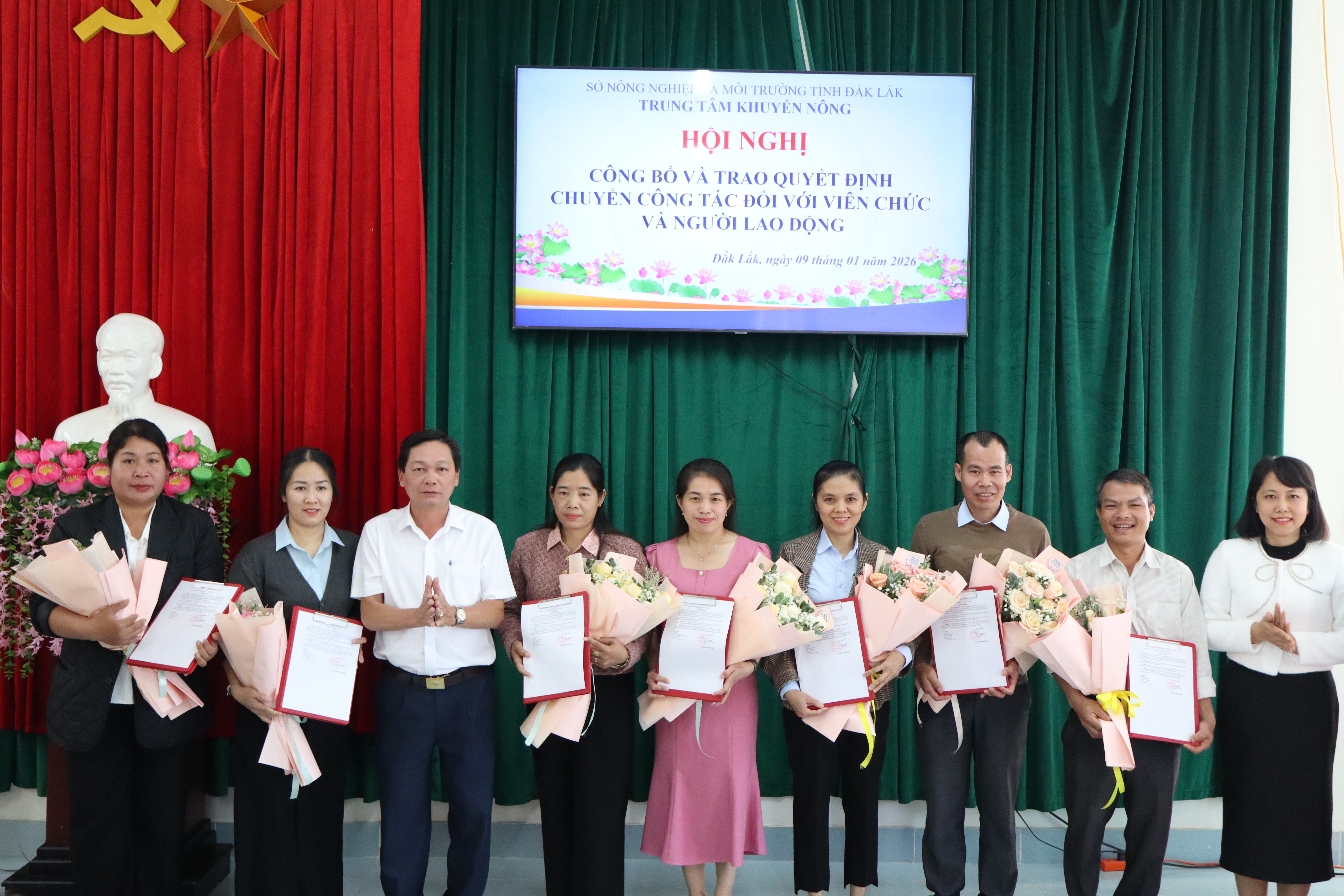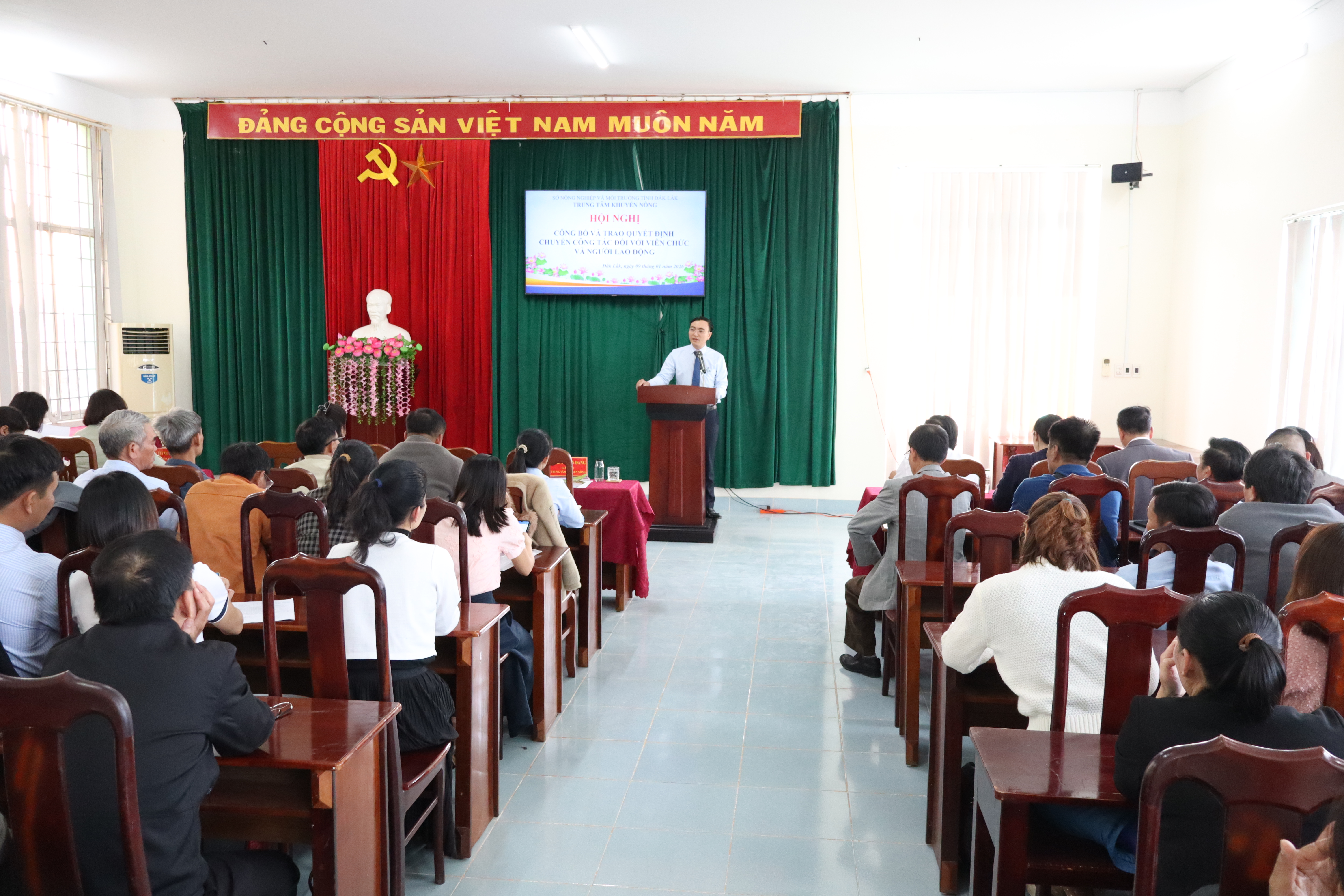 Thực hiện Quyết định số 02322/QĐ-UBND ngày 15/12/2025 của UBND tỉnh Đắk Lắk về việc tổ chức lại Trung tâm Khuyến nông trực thuộc Sở Nông nghiệp và Môi trường trên cơ sở kết thúc hoạt động của các Trạm Khuyến nông khu vực, chiều ngày 09/01/2026, Trung tâm Khuyến nông tỉnh Đắk Lắk đã tổ chức Hội nghị công bố và trao Quyết định chuyển công tác đối với viên chức và người lao động.